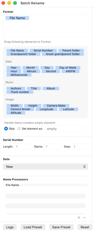 Quick Rename Save a renaming rule from Advanced Mode as a preset. It can be quickly launched via the Context Menu or the Sidebar.