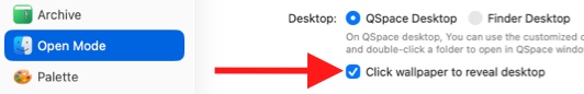 Click wallpaper to reveal desktop Toggle this in QSpace Settings > Open Mode > Desktop.