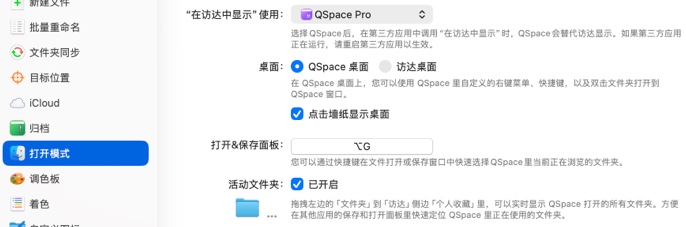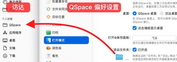 活动文件夹 开启活动文件夹,将文件夹拖放到 访达 的 个人收藏,即可在访达中快速访问 QSpace 里打开的文件夹。