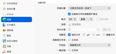 忽略项 可选择在创建压缩包时忽略 临时文件(.DS_Store 和 __MACOSX)、.git、.svn、隐藏文件。