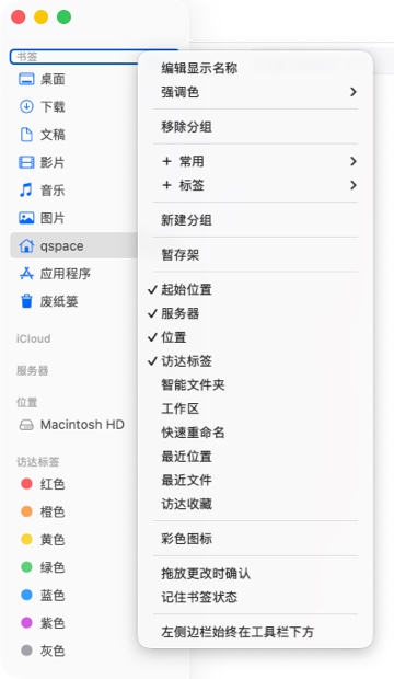 按下 Command + Option + S 切换侧边栏显示,在侧边栏上弹出右键菜单可对其进行自定义设置。