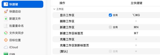 显示工作区 打开工作区列表或唯一工作区,默认全局 Option + Command + G。