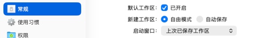 新建工作区 选择“自由模式”不会自动保存新建工作区,可以按 Command+S手动保存。